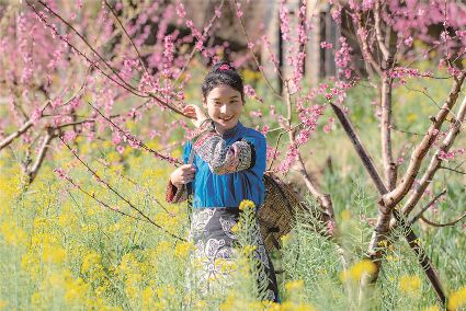 抬望眼,坡上繁花似錦,余暉里,若粉色華蓋覆于坡上,若云若霞。桃林置身峽谷之中,粉面朝天,明艷非凡,宛如閨秀;人家坐落山麓之上,披煙戴云,絕食煙火,疑為仙廬;山溪清卷碧波而去,棲云而眠,漱石而歌,響似佩環(huán)。橘色棧道蜿蜒而上,桃花林里若隱若現(xiàn)棧道間著漢服者,或留倩影,或嗅花香;拾級而上,又見客家姑娘,身著藍(lán)底配黑褂,綴以白色圖案,提籃摘豆,俯身拾花,別在耳鬢遠(yuǎn)望,若畫中紅印印在發(fā)間,身后白色梨花綠色葉。