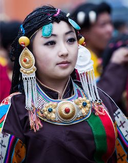 藏裝的基本特點是長袖、寬腰、大襟、肥大。直線寬邊,色彩對比強烈。男女藏袍均習慣以粗紡厚毛呢為料,左襟大,右襟小,一般在右腋下釘一個紐扣,或是用紅、藍、綠、雪青等色布做兩條飄帶,穿時結(jié)上。男式藏袍多為黑、白兩色,領圍、袖口、衣襟和底邊,鑲上色布或綢子底邊,古樸渾厚。夏天或勞動時,一般只穿左袖,右袖從后面拉到胸前搭在左肩上,也可左右袖均不穿,兩袖束在腰間,古銅色的皮膚袒露于外,雄風凜凜,彪悍剛健。女式藏袍,分有袖和無袖的兩種,夏秋兩季的藏袍無袖。里面多襯有紅、綠等色彩鮮艷的襯衣,襯衣翻領在外,衣袖要長于胳膊一至二倍,長出部分,平時卷起,舞蹈時放下,舒展飄逸,瀟灑自如。藏族的帽子式樣繁多,各地均有不同,拉薩等地以金寶頂帽為最多,用金絲或銀絲繡織圖案,在陽光照耀下,閃閃發(fā)光。金花帽是男女老幼都喜歡戴的民族帽。男女穿的藏靴,底高二寸,靴腰高至小腿以上,靴面用紅綠相間的毛呢裝飾,繡有圖案花紋。靴頭向上隆起。藏族男女喜歡佩飾。耳穿大環(huán),手腕金銀,頂戴珠鏈,尤其是在腰間,男挎長劍,女佩腰刀,更顯得粗獷彪美。
