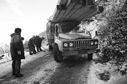 一九九七年十一月二十四日,連續(xù)多日大雪,把整個二郎山裹得嚴嚴實實,白茫茫一片。陣陣山風吹過,大霧就像瀑布一樣,從山頂直往下翻涌傾瀉。 一大早,州交通局打冰除雪排險的干部職工就從二郎山管理站直奔山埡口。載有防滑砂的大貨車穿迷霧,繞山梁,向山頂埡口疾馳。由于氣溫太低,霧又大,車上的擋風玻璃很快就結(jié)下了冰,路面打滑非常嚴重。前面車輛堵了起來,排險人員只好下車步行。 大霧彌漫,能見度很底,陰霾的天空又飄起了紛紛揚揚的雪花,剌骨的寒風陣陣襲來,只聽見車蓬布在風中“嗶剝”作響,卻看不見前面到底堵了多少車。排險人員只好相互攙扶踩著冰滑的邊路艱難地向行。好不容易來到堵在最前面的車子面前。原來是一輛載著原木的東風牌大貨車側(cè)滑在公路上,把整個公路堵死了。 局領(lǐng)導當即指揮大家用鋼釬、鐵鎬和鋤頭處理冰道,沒有撮箕,大家借來加水桶裝運冰雪……氣溫仍在急劇下降,剛從雪堆里刨出來的路,又被結(jié)起一層冰,就像地面上澆上了油,這就是冰雪道上有名的“桐油凌”。 有二位老同志不顧年老體弱,積極參與打冰除雪,一個在打冰時,被彈起的冰碴把腦門劃了一個口子,鮮血直往外冒。有人想幫他包扎,他堅決不干,自己就用手帕按住,把帽子向下拉蓋住傷口就算了。血從手帕中浸透出來,與眉毛上的冰凌結(jié)在一起。氣溫太低,冰層太厚,十字鎬每挖一下,多數(shù)情況下也就是挖下一個白點而已。不一會兒,另一位老同志已是滿頭大汗,大家勸他休息一下,他卻說:趁著現(xiàn)在雪不是太大,早點把主道上的冰雪多除點,過往二郎山的車輛就多一份安全。 排險人員的手凍紅了,刨冰雪碰傷的指頭還流著鮮血,身上蒸發(fā)的熱氣,把衣領(lǐng)口、袖子口和褲子口結(jié)成了冰,可是,誰也沒有吭一聲。 ……受堵車輛終于向前開動了。 風,越刮越猛,雪,越來越大。 防滑車在冰雪道上艱難地向前爬行著,車箱上面的職工們揮舞的洋鏟向路面撒著防滑砂。一路上風絞雪,防滑車象一頭不聽使喚的牛,顛簸、亂竄,好不容易才來到260(二郎山最險處),對這里“桐油凌”路面進行重點防滑處理后,防滑車又返回來,開始向山頂進發(fā)……風雪二郎山上打冰除雪、防滑排險,看似沒有驚天動地的壯舉,身臨其景才知其艱難辛苦。難怪當年每每經(jīng)過二郎山冰天雪地奇險路段的車,都會向風雪中屹立路邊的交通系統(tǒng)排險保暢通的職工們鳴笛致敬,風雪中的那份情彌足珍貴。 川藏線上的老司機傳下來一首傷心的順口溜:“車過二郎山,如闖鬼門關(guān),萬幸不翻車,也要凍三天!”其險峻實為罕見,尤其是途經(jīng)二郎山260(公路公樁)處,曾被淡虎色變的人稱為“鬼招手”的險路段。 1983年1月3日,有著安全行車44萬公里記錄的一位駕駛員開著輛嶄新的東風牌貨車,同行還有兩名職工,夜行二郎山,在彌天大霧中神秘地“失蹤”了。十五天后,搜山的人才用望遠鏡看到260公里路樁處的山崖下,有一塊汽車破篷布掛在樹枝,猶如招魂的凄厲幌幡在冷風中招搖晃動。鋼纜繩吊著搜山的人下到崖下400米深處的谷底。扒開一座座雪堆,叫人汗毛倒豎:雪堆下,盡是廢大梁、爛車廂、銹車頭和支離破碎的汽車,足有一個汽車連!一輛不知埋了多久的卡車廂里牛肉已腐爛,駕駛室里坐著三具發(fā)黑的僵尸……其狀慘不忍睹!