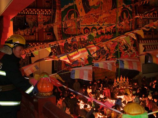 康定的幾座黃教寺廟舉行了法會(huì),擺酥油花,燃元根燈供佛。信教群眾除在家供燈外,有的還登跑馬山,赴南無(wú)寺敬燈油。入夜后又成群結(jié)隊(duì)涌向康定城中的安覺寺,參加元根燈會(huì),以此紀(jì)念藏傳佛教格魯派創(chuàng)始人、宗喀巴大師圓寂成佛。安覺寺里人潮涌動(dòng),熱鬧非凡。有扶老攜幼的信教群眾,有祈求平安的生意人,也有慕名而來(lái)的外地?cái)z影師。燈會(huì)這天,最忙碌的除了寺廟里的喇嘛,就數(shù)在寺廟周圍站崗的消防員了,消防員李剛說(shuō):“一大早就有遠(yuǎn)道而來(lái)的信教群眾和僧尼到寺廟里點(diǎn)燈了,為了保障寺廟的消防安全,我們已經(jīng)在這飄著雪花的冬日里站了整整一天了,要等到每一盞燈都安全的燃盡,我們才可收隊(duì)離開。”