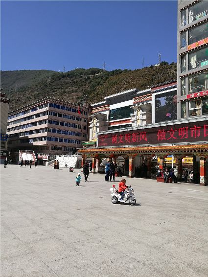 天空像剛被浸染的綢緞,蔚藍(lán)的主色已經(jīng)略顯;白雪好似從浸染的綢緞上滴落下的顏料與其它顏色的混合,眷戀的駐足在山尖,在其耳旁傾訴來年的約定;一顆顆萬年青穩(wěn)穩(wěn)的站立,將山中的寺廟、亭閣緊緊地包圍,見證著康定四季輪回的變化;依然披著秋冬贈予黃色外衣的樹木,拋開桎梏,堅(jiān)守在一座座樓房旁。藍(lán)與白,黃與綠……這大美的晴天為人們帶來了別樣的視覺盛宴。