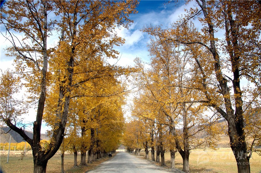 一條淺淺的小河與公路相依相偎地蜿蜒流淌,房前路旁一棵棵挺拔的白楊在秋風(fēng)秋陽中炫耀著特有的金黃。遠(yuǎn)處的山脊,舒緩地在天幕上劃出一道道優(yōu)美的弧線。滿眼藍(lán)色、白色、金黃、黑色、綠色的飽和色塊,在明麗的秋陽光線的描繪中,凸現(xiàn)著流暢的色彩和線條,恍如置身畫中。