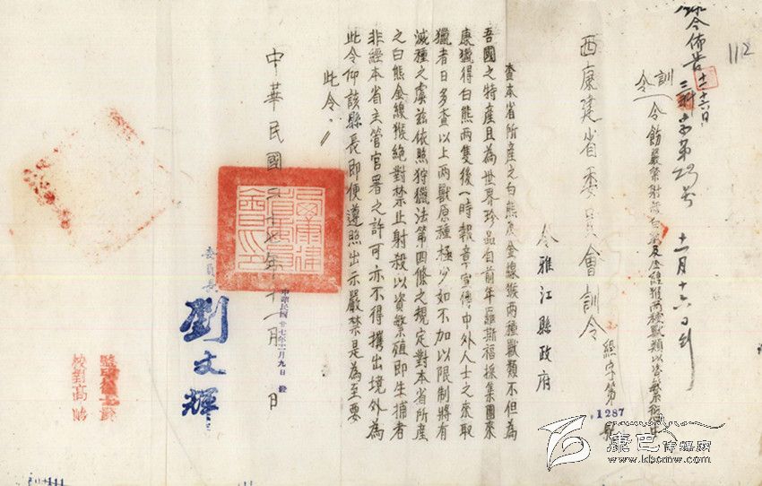 民國(guó)27年(公元1938年),“西康省建省委員會(huì)”發(fā)出“經(jīng)字第1287號(hào)”訓(xùn)令,這是一份難能可貴的保護(hù)野生動(dòng)物的訓(xùn)令,訓(xùn)令說(shuō):“查本省所產(chǎn)之白熊及金線猴兩種獸類,不但為吾國(guó)之特產(chǎn),且為世界珍品。自前年羅斯福采集團(tuán)來(lái)康獵得白熊兩只后,一時(shí)報(bào)章宣傳,中外人士之來(lái)取獵者日多。查以上兩獸原種極少,如不加以限制,將有滅種之虞。茲依照狩獵法第四條之規(guī)定,對(duì)本省所產(chǎn)之白熊、金線猴絕對(duì)禁止射殺,以資繁殖。即生捕者非經(jīng)本省主管官署之許可,不得帶出境外。為此令仰該縣長(zhǎng)即便遵照出示嚴(yán)禁是為至要,此令。”訓(xùn)令最后署有“西康建省委員會(huì)委員長(zhǎng)劉文輝”的簽名。