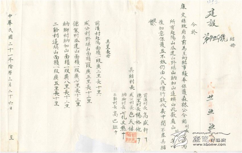 布告張貼出去后,大渡河流域康定縣屬的前溪、德笨、納腳、威公、二朗等五個村長向縣政府寫出了由自己親自簽名畫押的“具結書”,把自己村落所在地的林林面積造出表冊“具呈”,并保證“以后加以保護,不敢仍由人民自由砍伐”。