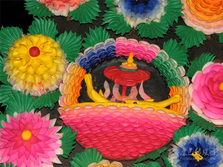 酥油花酥油花雖名曰“花”,但其題材多樣,內(nèi)容豐富,主要以佛祖神仙、菩薩金剛、飛禽走獸、花鳥魚蟲、山林樹木、花卉盆景組成各種故事情節(jié),形成完整的立體畫面。它的造型特點(diǎn)和手法類似國(guó)外盛行的臘像藝術(shù),但不宜長(zhǎng)期保存。酥油花藝術(shù)繼承藏傳佛教藝術(shù)的精、繁、巧的特點(diǎn),在一個(gè)有限的空間中容納極多的內(nèi)容。大至一米到二米,小至十到二十毫米的人物走獸,個(gè)個(gè)精到,力求寫實(shí),而其姿態(tài)神韻力求傳神達(dá)意。在畫面布局上則繼承佛教壁畫中“異時(shí)同地”的處理方法,在同一畫面中將一個(gè)完整的故事內(nèi)容同時(shí)塑造出來(lái)。如大型酥油花《釋迦牟尼本生故事》。 酥油花的制作必須在冬季低溫下進(jìn)行,因而塔爾寺酥油花都在每年農(nóng)歷正月十五日塔爾寺燈節(jié)展出,屆時(shí)來(lái)自西藏、內(nèi)蒙古,四川等地的農(nóng)牧民及海內(nèi)外游人云集山之中,山上山下,寺宇周圍,入山人海,為一睹晶瑩剔透的酥油花。