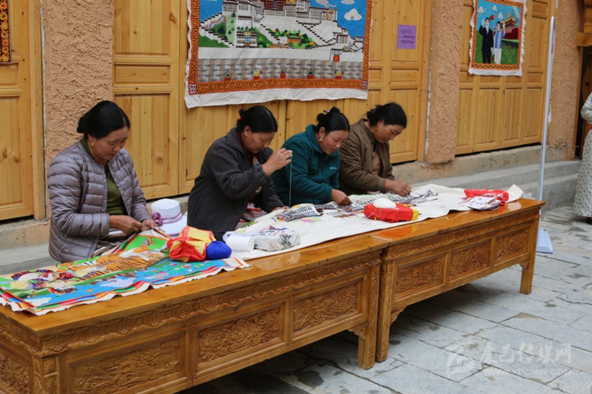 在藏繡展點(diǎn),5名農(nóng)牧民婦女正在合繡一幅藏族建筑刺繡作品?!拔覐?6歲開(kāi)始跟著父親學(xué)藏繡,傳到我這已經(jīng)是第四代了。除了‘六長(zhǎng)壽’、度母像等傳統(tǒng)圖案,今年是新中國(guó)成立70周年,我還繡了一幅天安門(mén)作品?!?7歲的傳承人達(dá)打介紹道。