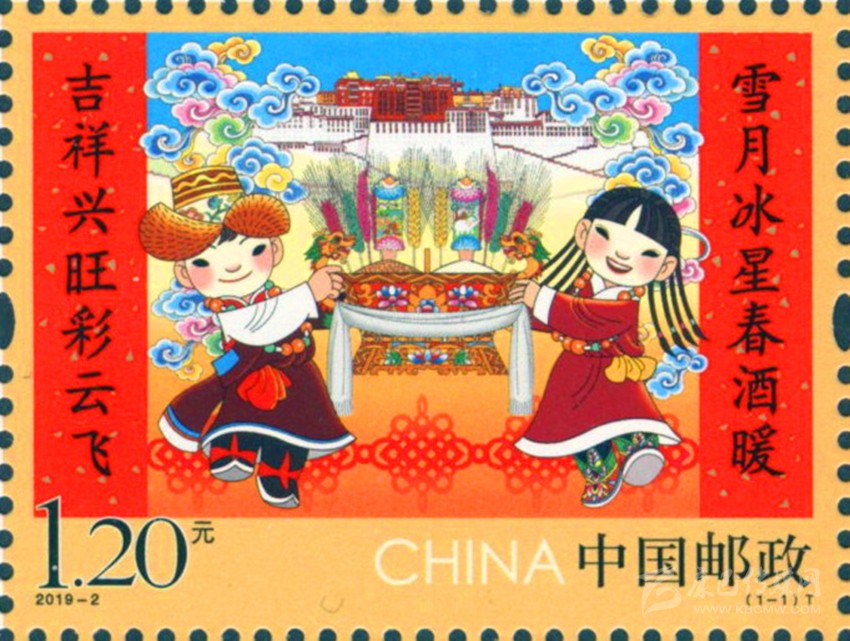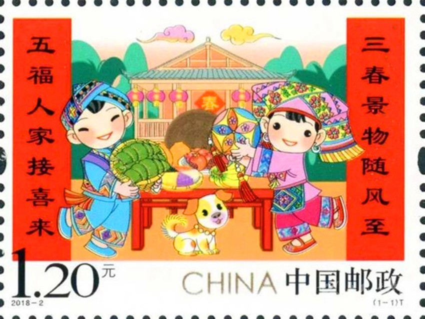 彰顯中華民族特有人情味的拜年郵票。拜年是我國(guó)春節(jié)的主要習(xí)俗,是中華民族優(yōu)秀的傳統(tǒng)文化,是人與人之間情感凝聚和維系的重要禮節(jié),具有獨(dú)特人情味。中國(guó)郵政從2015年至2019年連續(xù)發(fā)行了五組“拜年”系列郵票。2015年中國(guó)郵政發(fā)行的第一組《拜年》郵票,以其獨(dú)特的卡通風(fēng)格和濃郁的民俗特色,展現(xiàn)了人們過(guò)大年,拜大年時(shí)的喜悅場(chǎng)景。2018年正好是廣西壯族自治區(qū)成立六十周年,中國(guó)郵政發(fā)行 《拜年》郵票,畫(huà)面展現(xiàn)了壯家人過(guò)年時(shí)熱情好客的場(chǎng)景,桌子上擺放著柚子、香蕉、五色飯等當(dāng)?shù)靥厣褪澄?,打開(kāi)的石榴籽粒飽滿、顆顆相抱,正如我國(guó)56個(gè)民族緊密團(tuán)結(jié)在一起,形象貼切地體現(xiàn)了習(xí)近平總書(shū)記提出的“各民族要像石榴籽那樣緊緊抱在一起”的教導(dǎo)。 2019年春節(jié)恰逢與藏歷新年同一天,中國(guó)郵政發(fā)行的《拜年》郵票,郵票主圖畫(huà)面上“歡歡”與“喜喜”兩名藏族兒童,身穿藏族的盛裝,在布達(dá)拉宮前載歌載舞,整個(gè)畫(huà)面展現(xiàn)了藏族同胞歡快愉悅,喜慶新年的畫(huà)面,同時(shí)也表達(dá)了全國(guó)各族人民在黨的領(lǐng)導(dǎo)下,幸福生活,共筑中國(guó)夢(mèng)的美好寓意。