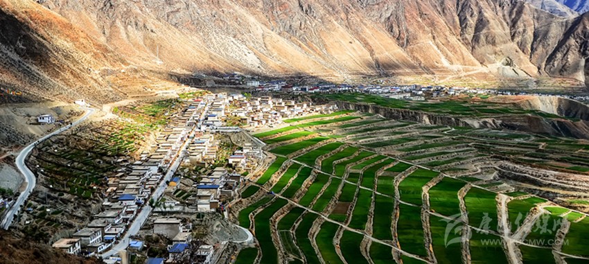 從得榮縣城出發(fā),途經(jīng)日龍鄉(xiāng),汽車順著盤山公路開(kāi)始往下行駛,到半山腰處,司機(jī)輕輕踩一腳剎車熄火,在此作短暫休息。這時(shí),我打開(kāi)車門俯瞰金沙江畔的因都?jí)危?jiàn)公路兩側(cè)一排排整齊的房屋像火柴盒一樣連綴在平坦壩子上,房屋下端,麥田梯次舒展,麥浪涌動(dòng),蔚為壯觀。