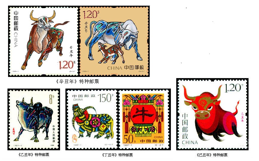 1997年1月5日發(fā)行第二輪生肖郵票中的“牛票”,即《丁丑年》特種郵票,全套2枚。由郵票設(shè)計師呼振源設(shè)計。第一枚“金牛奮蹄”,畫面依據(jù)山東省高密縣方市鄉(xiāng)前曹戈莊村當(dāng)時33歲的農(nóng)村女子齊秀花的剪紙作品《媳婦騎牛圖》進(jìn)行設(shè)計,原作中的“媳婦”被刪去,突出了牛的形象,體現(xiàn)出膠東地區(qū)民間剪紙藝術(shù)源于生活、構(gòu)思巧妙、粗獷中多見細(xì)膩的本色。只見那彎彎的牛角,垂地的長尾,壯實的牛身,穩(wěn)健的四蹄,都真實地再現(xiàn)了生活中牛的特點,牛身上似花非花,似銅錢又非銅錢的紋飾,充分地表現(xiàn)出樸實的浪漫主義。第二枚“牛耕年豐”,畫面主圖為一只高高掛起的大紅燈籠上,映出了一個醒目的隸書“?!弊?,為牛年的慶春象征。圍繞著這只燈籠,又進(jìn)行了幾多創(chuàng)意,兩只喜鵲和一朵梅花,喻意“喜鵲登梅”;旒蘇上的兩朵牡丹,代表幸福、富貴;特別是那春意盎然的“雙牛圖”,畫面雖小,確為點睛之筆,與主圖的大“?!弊志o密呼應(yīng)。