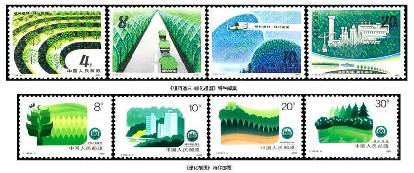 1980年3月12日,我國第一個植樹節(jié),中國郵政發(fā)行《植樹造林,綠化祖國》特種郵票,全套4枚。第一枚“經(jīng)濟林”,圖案是生長有序的梯田式的經(jīng)濟林林業(yè)基地。第二枚“四旁綠化”,即在宅旁、村旁、路旁和水旁因地制宜有計劃地種植經(jīng)濟林木以綠化城市、美化環(huán)境、護路護堤、凈化空氣以及為社會創(chuàng)造財富,圖中寬闊的道路兩旁綠油油的樹令人心情舒暢。第三枚“飛播造林”,圖案是在翠綠的群山間一架飛機正在向山嶺撒播樹種進行造林,在飛機拉出的煙霧中有“植樹造林,綠化祖國”八個字,體現(xiàn)了我國植樹造林走全民動員和現(xiàn)代化的道路。第四枚“廠礦綠化”,廠礦置于一片綠色海洋之中,形成了美麗的園林化廠區(qū)。
