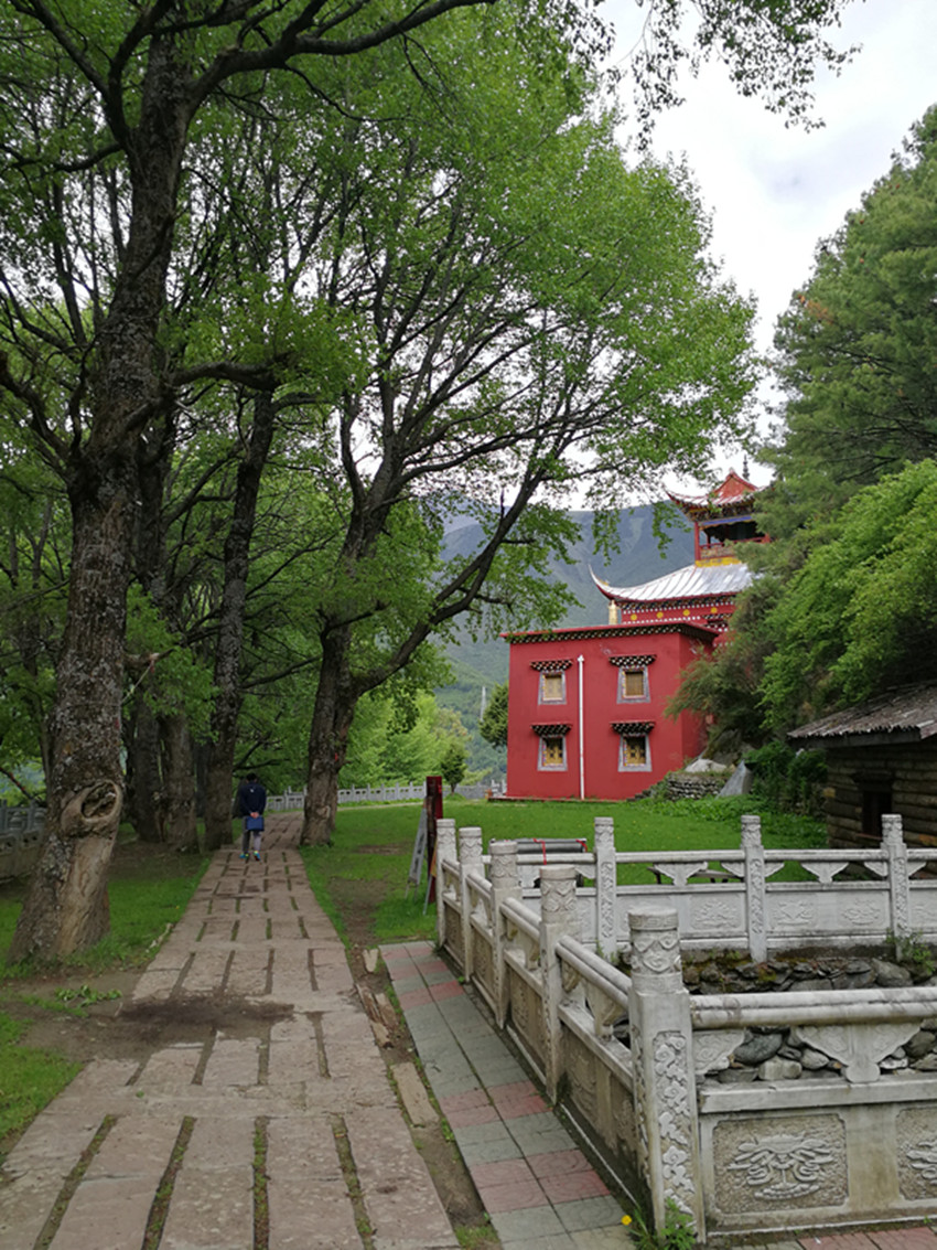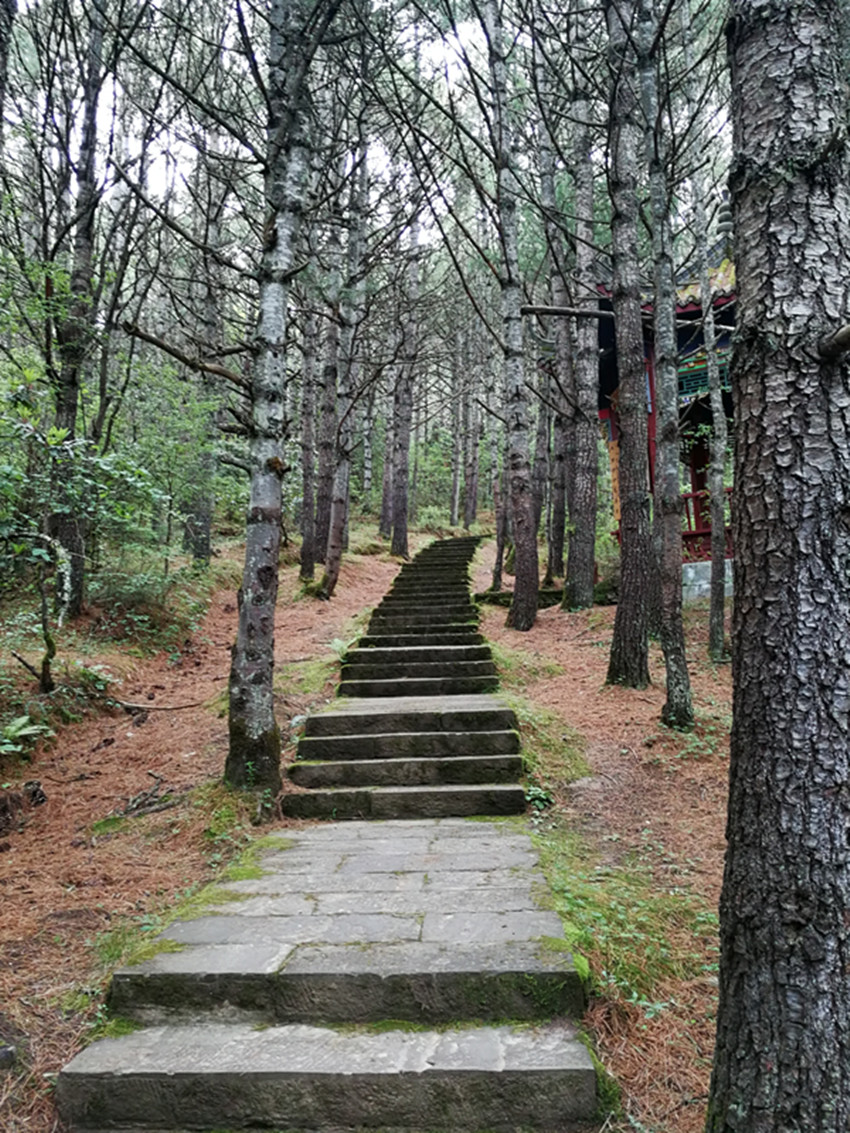 中國(guó)民俗有“大年初一不竄門”,這一天,康定人很多都會(huì)去寺廟燒香敬佛。前年大年初一,我便去了觀音閣。進(jìn)門處,有專供燒紙錢的地方。再上階梯,有長(zhǎng)列的白色佛塔,進(jìn)寺就可點(diǎn)燈朝拜。出了觀音閣,我順道去找獅子巖。公路一側(cè)的堡坎已將原來(lái)的小徑斬?cái)?,翻上堡坎,小徑幾乎已沒了蹤跡。再仰頭望,獅子巖已是掩映在濃密的綠樹雜叢間。長(zhǎng)在右側(cè)的花椒樹,已不見蹤影。幾株高大的白楊樹遮天蔽日,最大的都長(zhǎng)到盆口粗了?!鞍倌陿淠尽?,這無(wú)疑還是當(dāng)年那幾棵白楊樹了。我艱難地鉆過(guò)荒叢爬到獅子巖腳下,那“祭祀臺(tái)”上如過(guò)去一樣擺放有貢品,旁邊和樹枝上掛有經(jīng)幡,但周圍仍沒有一絲煙熏火燎過(guò)的痕跡。