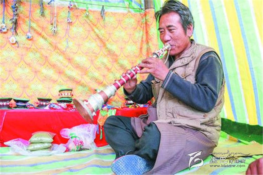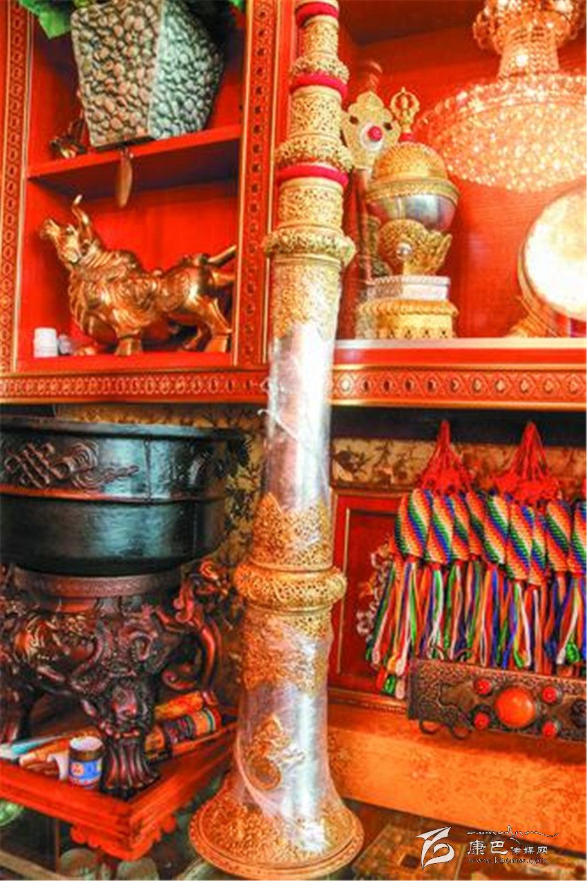 在河坡一代,像根秋丹貞、伍金這樣的手工藝人還有很多很多。其麥一家和根秋丹貞家一樣,也是主要制作佛器,在他的記憶里,爺爺、父親、叔叔、伯伯都是制作藝人,而自己家到底有多長的制作歷史,連他都說不清楚。51歲的扎西次仁這幾天有點忙,聽說噶陀寺最近要舉行法會,而以法器制作為主的他,早早的就在噶陀寺的臨時商點支起了“小賣部”,在這里叫賣自己家的精品法器,嘎烏、計數(shù)器、法號等等讓記者看得應(yīng)接不暇。