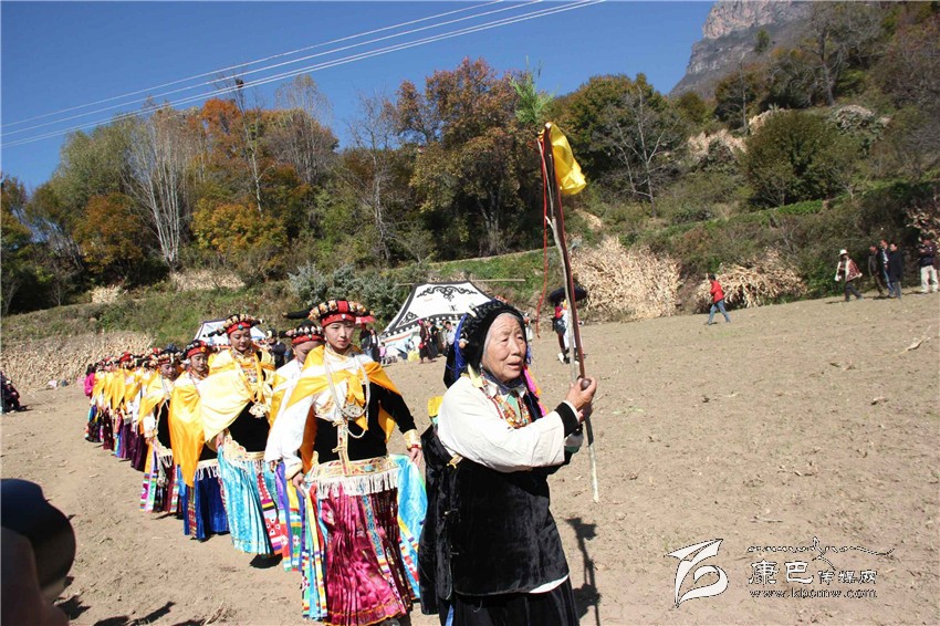 所有的祈福儀式結(jié)束后,村子里一位德高望重的長輩走上圓臺,用雄渾有力的嗓音向場地外等候的人們發(fā)出指令。在一段念詞結(jié)束之后,參加成人儀式女孩們的父親們在一位老人的指引下緩緩的向場地中央走來,老人手舉一幅一米高的唐卡畫,口中念念有詞,走在他后面的父親們一襲白色的毪衫,頭戴一頂灰色的禮帽,腳穿紅黑相間的藏靴,頸上掛著一根潔白的哈達,滿臉肅然的緊隨老人之后,來到月形的臺子邊,站成一個半圓形。當(dāng)父親隊站定后,母親隊們也向場地中移步而來,本次成人儀式的主角們在一位老阿媽的帶領(lǐng)下向場地中走來,每一位女孩穿著打扮都是那么的光鮮靚麗,每一個人都顯得美麗動人,她們披著黃色的披風(fēng),一根白色的哈達在胸前打著結(jié),五顏六色的哈達懸掛在這根哈達上,在姑娘們的后背迎風(fēng)飄飛。走到圓臺邊,小女孩們也圍成半圓,低著頭,等待著喇嘛們的念經(jīng)祈福和家人的祈福。此時,兩位吉祥老人站了起來,手中拿著凈瓶,走到姑娘們面前,一邊念誦經(jīng)文,一邊將手中凈瓶里的水倒在姑娘們的手心里,姑娘們則虔誠的將這圣水輕輕的抹在自己的額頭上,寓意吉祥如意。待喇嘛主持儀式結(jié)束后,主持儀式的老人用嘉絨語向蒼天和墨爾多神山祈禱,希望神賜予孩子們美麗的面容和美好的心靈,從今日起,她們就可以真正的長大成人了。吉祥詞念誦完后,母親們排著長長的隊伍緩緩來到孩子們的面前,將懸掛在胸前的哈達取下,久久的凝視著女兒的臉,眼角掛著幸福的淚水,用顫抖的聲音為女兒祈福,叮囑孩子們要孝敬父母,做一個正直善良的人,然后,才將白色的哈達掛在女兒的頸上,父親們則站在原地,看著母親們將哈達和祝福送給女兒,見證著女兒們的長大成人。接受完父母和長輩們的祝福之后,盛大的鍋莊舞會開始了。小女孩們也跟隨著這些舞者們手牽著手走到場地中央,跳起歡快的鍋莊舞。擁忠大娘說,成年禮上的鍋莊舞會一般都要視參加成人禮儀式女孩們親戚多寡而定,每一名長輩都會走到場地中牽頭,跳起舞蹈,這時候是女孩的長輩們炫耀舞技和歌聲的時候,他們矯健的舞步和甜美的歌喉迎來眾人的和鳴。