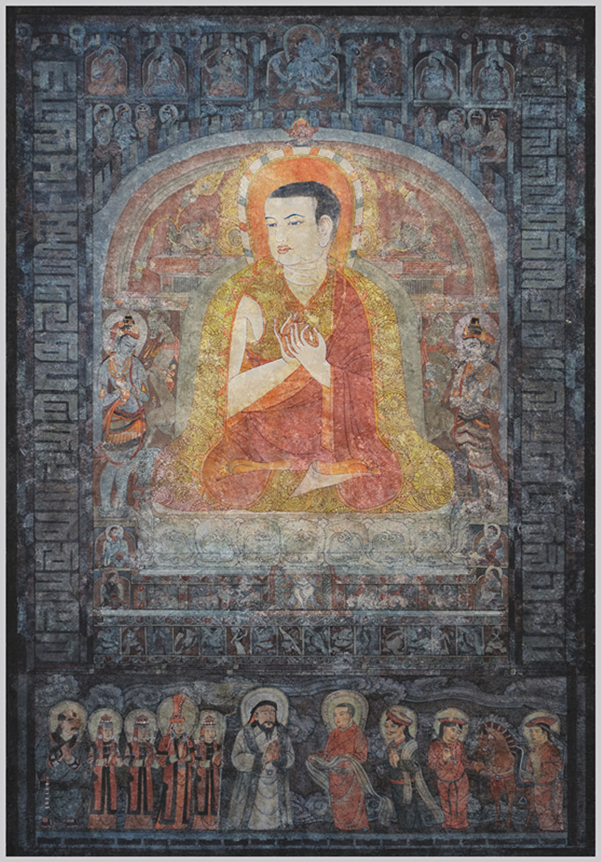 工筆畫作品《大元帝師八思巴》是我在2012年創(chuàng)作的,該作品表現(xiàn)了歷史上西藏高僧八思巴的英偉形象和他的傳奇經(jīng)歷。作品畫心寬約105厘米,高約152厘米,八尺云龍紙裁小使用。材料包括:礦物顏料、植物顏料、水彩顏料和丙烯顏料等。賦色方面使用礦物顏料在生紙上皴擦出滄桑的斑駁美感。用深淺冷暖來讓八思巴坐像和“六盤山相聚”在畫面上顯現(xiàn)出來,而其他內(nèi)容則逐漸隱藏于漫漶的背景里面。畫面正中身著華美僧衣者就是薩迦五祖之八思巴,他有著昆氏家族的尊貴容貌、有著薩迦法王教主的莊嚴(yán)神態(tài);他雙手結(jié)轉(zhuǎn)法輪印于胸前,跏趺坐于金剛法座之上,法臺(tái)正中的海螺正是薩迦派圣物。昆氏家族世代以“三怙主”(文殊菩薩、觀音菩薩和金剛手菩薩)化身而傳承教法至今,故教派寺院圍墻涂有象征“三怙主”的紅、白、藍(lán)三色,故又稱“花教”;所以在畫面頂上主尊的位置分別是觀音、文殊、金剛手三位菩薩。