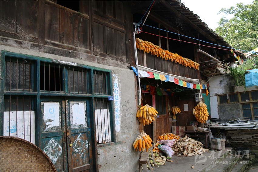 “這算是原生態(tài)的土司房了”,穿過小道,董老指著一間木板房;“是的,不過它的危險系數(shù)很高。”余華應道。近看,門窗屋檐做工精細,散發(fā)著古樸感,但也不難發(fā)現(xiàn)屋身的“補丁”;后退兩步觀望,整個屋身稍傾斜,是典型的危房。繼續(xù)行走,是泥土和木板結構的房屋,這也是上衙門遺址最后一站。據(jù)董老講述,這里是土司老爺審人的地方,犯人就跪在門坎的大石階上。不過,金黃玉米與鋼筋門窗的出現(xiàn),很難讓人想象土司老爺在該地審案的景象。