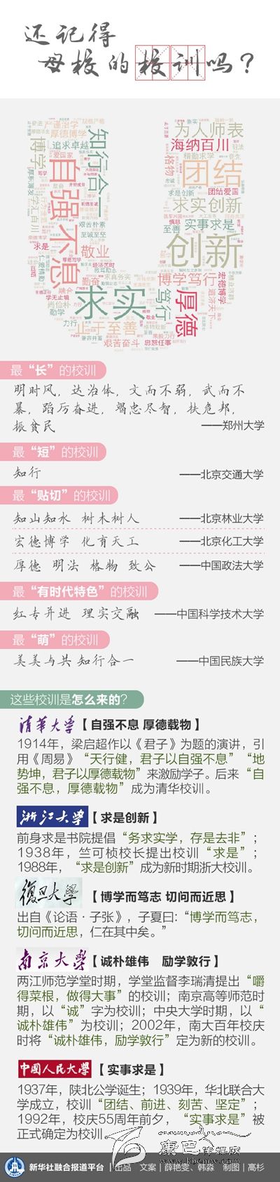 一份對100多所中國高等學(xué)府校訓(xùn)的統(tǒng)計顯示,出現(xiàn)頻次最高的詞是“求實”,其次是“創(chuàng)新”、“博學(xué)”、“厚德”,一個‘實’字始終貫穿于不同時代、不同環(huán)境的校訓(xùn)之中。