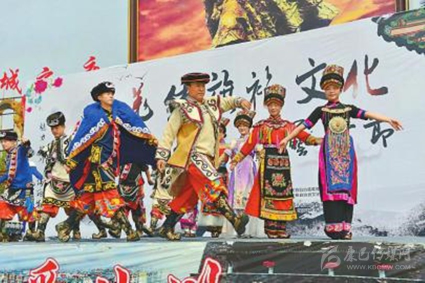 4月29日,綿陽(yáng)市北川羌族自治縣巴拿恰街文化廣場(chǎng),當(dāng)?shù)厝罕娚碇褡宸b走秀,歡度“五一”。 寇元林 攝