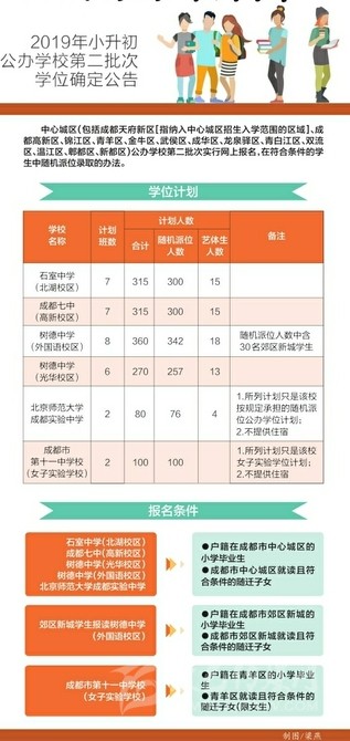 6月17日,記者從成都市教育局獲悉,根據(jù)《成都市教育局關(guān)于2019年小學(xué)畢業(yè)生初中入學(xué)工作的通知》(成教函〔2019〕35號(hào))規(guī)定,中心城區(qū)(包括成都天府新區(qū)[指納入中心城區(qū)招生入學(xué)范圍的區(qū)域]、成都高新區(qū)、錦江區(qū)、青羊區(qū)、金牛區(qū)、武侯區(qū)、成華區(qū)、龍泉驛區(qū)、青白江區(qū)、雙流區(qū)、溫江區(qū)、郫都區(qū)、新都區(qū))公辦學(xué)校第二批次(詳見學(xué)位計(jì)劃表)實(shí)行網(wǎng)上報(bào)名、在符合條件的學(xué)生中隨機(jī)派位錄取的辦法。網(wǎng)上申報(bào)時(shí)間為6月22日10:00至25日17:00;7月2日16:00,成都市招考辦將在服務(wù)平臺(tái)上載入派位結(jié)果,學(xué)校公布錄取學(xué)生名單。