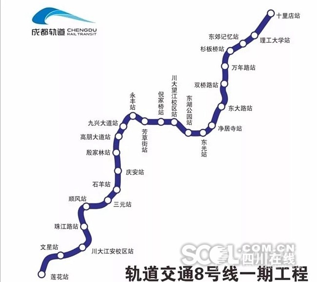 南起蓮花站,北至十里店站。沿線主要經(jīng)過雙流區(qū)、武侯區(qū)、高新區(qū)、錦江區(qū)、成華區(qū)。線路全長29.1km,共設車站25座,均為地下站、其中換乘站14座。