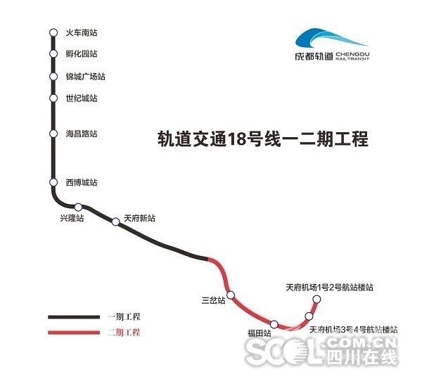 服務于成都市區(qū)與成都天府國際機場之間,北起火車南站,南至天府新機場,線路全長66.8Km,共設12座車站。(圖據(jù)成都軌道建設公司)