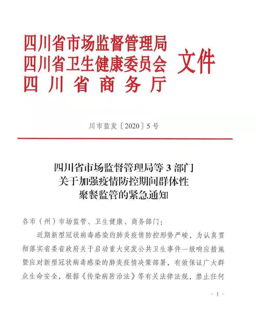四川新聞網(wǎng)成都1月25日訊(記者 李丹)1月25日,四川省市場監(jiān)督管理局、四川省衛(wèi)生健康委員會、四川省商務(wù)廳3部門聯(lián)合發(fā)布緊急通知,近期新型冠狀病毒感染的肺炎疫情防控形勢嚴(yán)峻,為認(rèn)真貫徹落實省委省政府關(guān)于啟動重大突發(fā)公共衛(wèi)生事件一級響應(yīng)措施暨應(yīng)對新型冠狀病毒感染的肺炎疫情決策部署,有效保證廣大群眾生命安全,根據(jù)《傳染病防治法》等有關(guān)法律法規(guī),禁止任何餐飲單位和個人舉辦任何形式的群體性聚餐活動,已經(jīng)訂餐的應(yīng)盡快取消或延期舉辦。