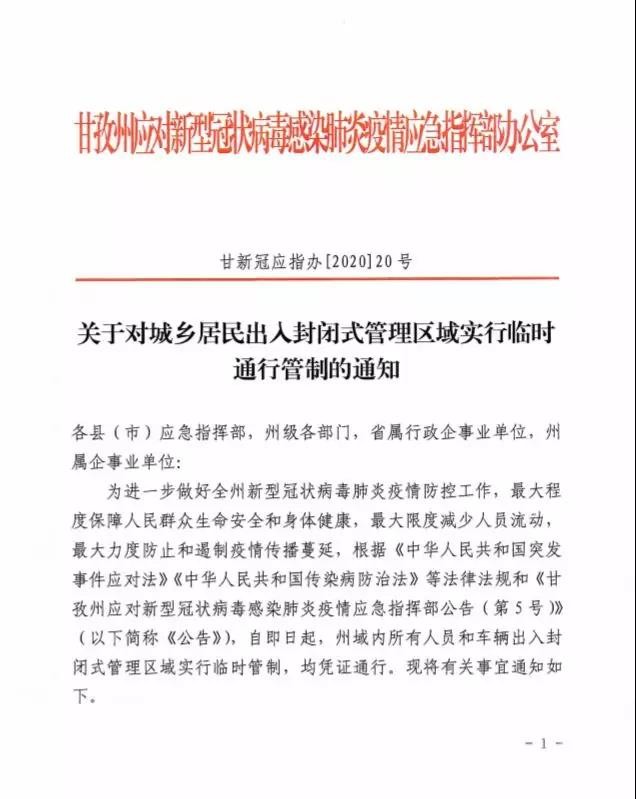 為進(jìn)一步做好全州新型冠狀病毒肺炎疫情防控工作,最大程度保障人民群眾生命安全和身體健康,最大限度減少人員流動(dòng)最大力度防止和遏制疫情傳播蔓延,根據(jù)《中華人民共和國突發(fā)事件應(yīng)對法》《中華人民共和國傳染病防治法》等法律法規(guī)和《甘孜州應(yīng)對新型冠狀病毒感染肺炎疫情應(yīng)急指揮部公告(第5號)》(以下簡稱《公告》),自即日起,州域內(nèi)所有人員和車輛出入封閉式管理區(qū)域?qū)嵭信R時(shí)管制,均憑證通行。現(xiàn)將有關(guān)事宜通知如下。