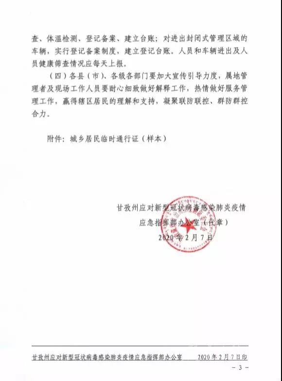 今(7)日,甘孜州應(yīng)對新型冠狀病毒感染肺炎疫情應(yīng)急指揮部發(fā)布通知,規(guī)定即日起對州域內(nèi)所有人員和車輛出入封閉式管理區(qū)域?qū)嵭信R時(shí)管制,均憑證通行,并公布了通行證制作發(fā)放方式。通知全文如下: