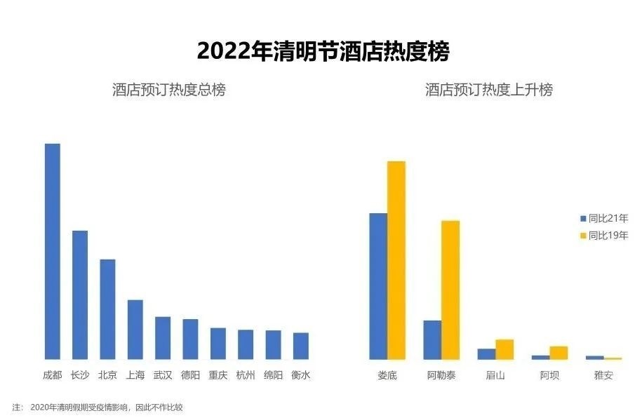攜程數(shù)智酒店大數(shù)據(jù)出具的《2022年清明節(jié)預(yù)測報(bào)告》也顯示,2022年清明期間,在全國文旅市場遇冷的情況下,成都、長沙、北京的酒店生意預(yù)測相對(duì)較好,位居熱度榜單前三。眉山、阿壩、雅安等城市的酒店預(yù)訂熱度同比2021年上升明顯。