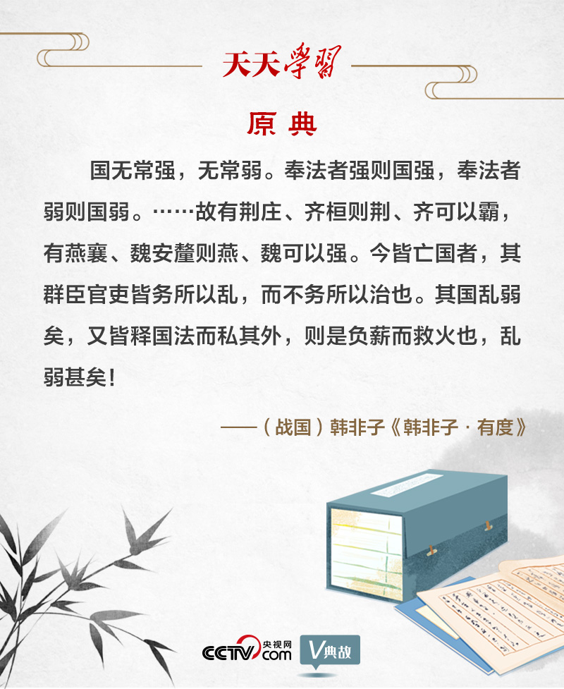 韓非子是戰(zhàn)國時期法家思想的集大成者?!坝卸取?,就是有法度。韓非子把“奉法”作為治亂興亡的關(guān)鍵,提出“國無常強,無常弱。奉法者強則國強,奉法者弱則國弱”。意思是,國家不會永遠(yuǎn)富強,亦不會長久貧弱。執(zhí)行法度的人堅決,國家就會富強;執(zhí)行法度的人軟弱,國家就會貧弱。