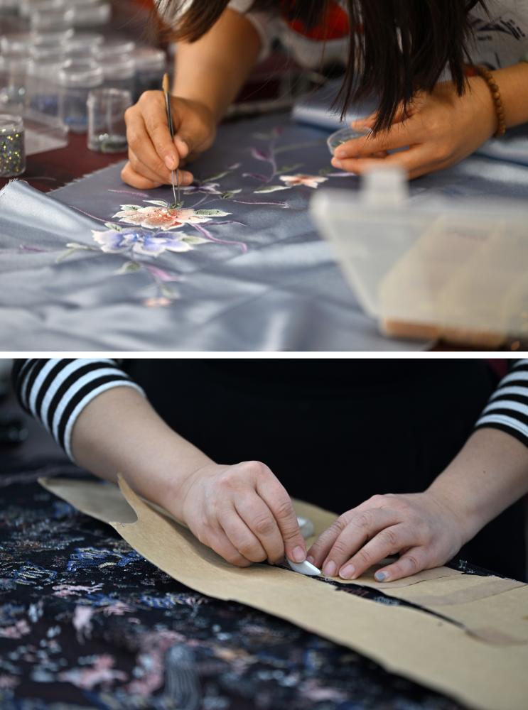 ??拼版照片:上圖為老美華定制車間的制衣師傅在面料上貼鉆;下圖為老美華定制車間的制衣師傅在面料上劃線(2023年12月8日攝)。天津老美華始創(chuàng)于1911年,歷史上以“千層底”布鞋聞名,是享譽(yù)津門的“中華老字號(hào)”。新華社記者 李然 攝
