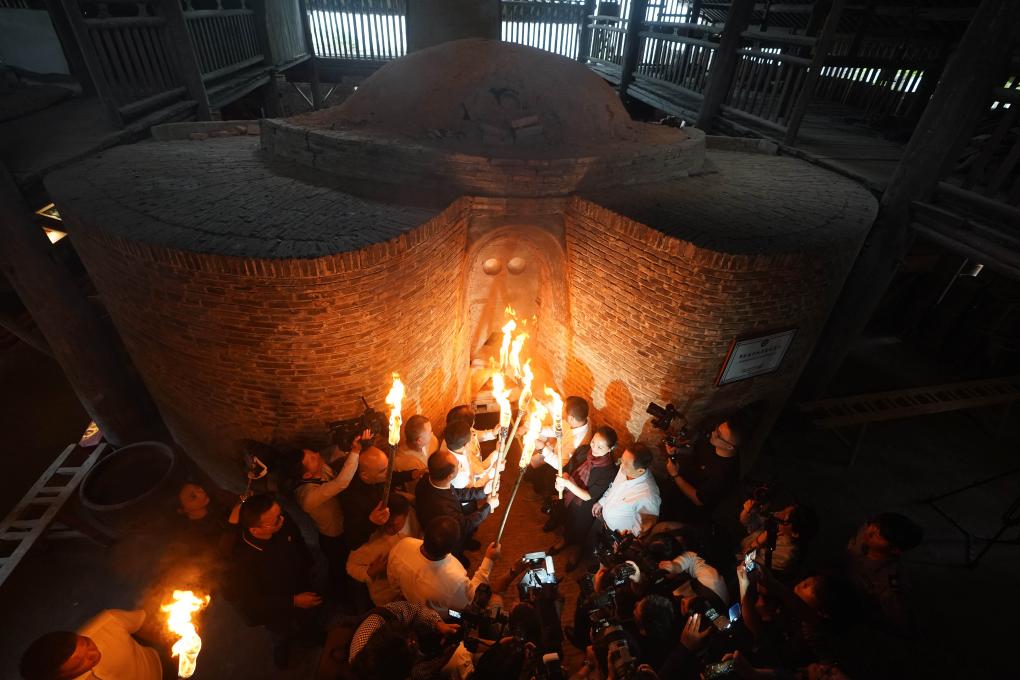 ??2023年10月19日,嘉賓與把樁師傅一起對(duì)葫蘆窯進(jìn)行復(fù)燒點(diǎn)火。當(dāng)日,作為2023中國景德鎮(zhèn)國際陶瓷博覽會(huì)的活動(dòng)之一,景德鎮(zhèn)古窯民俗博覽區(qū)對(duì)重建的明代葫蘆窯進(jìn)行點(diǎn)火復(fù)燒。同時(shí),景德鎮(zhèn)歷代瓷窯活態(tài)傳承紀(jì)實(shí)館開館。新華社記者 周密 攝