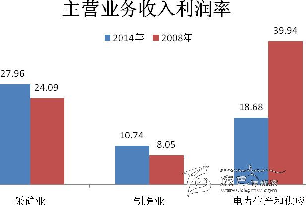 2013年,規(guī)模以上工業(yè)企業(yè)法人單位總資產(chǎn)貢獻(xiàn)率為8.46%,比2008年下降4.56個(gè)百分點(diǎn)。主營(yíng)業(yè)務(wù)收入利潤(rùn)率為18.83%,比2008年下降11.12個(gè)百分點(diǎn)。其中,采礦業(yè)為27.96%,比2008年上升3.87個(gè)百分點(diǎn);制造業(yè)為10.74%,比2008年上升2.69個(gè)百分點(diǎn);電力、熱力、燃?xì)饧八a(chǎn)和供應(yīng)業(yè)為18.68%,比2008年下降21.26 個(gè)百分點(diǎn)(詳見表2-4)。