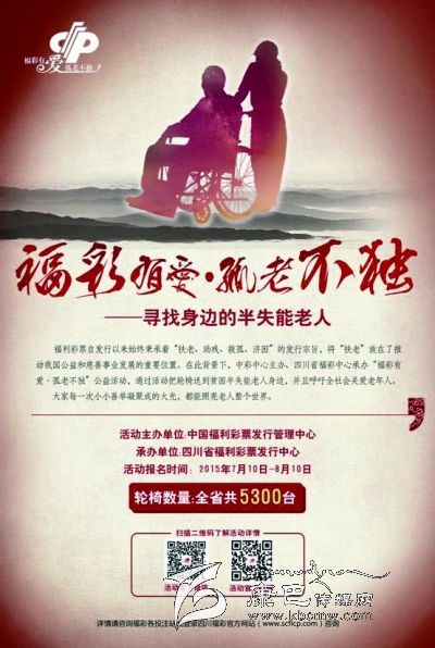 為踐行福利彩票“扶老、助殘、救孤、濟(jì)困”宗旨,州福彩中心將在全州范圍內(nèi)開展“福彩有愛·孤老不獨(dú)”大型慈善公益活動,特向我州貧困半失能老人免費(fèi)贈送福彩愛心輪椅。
