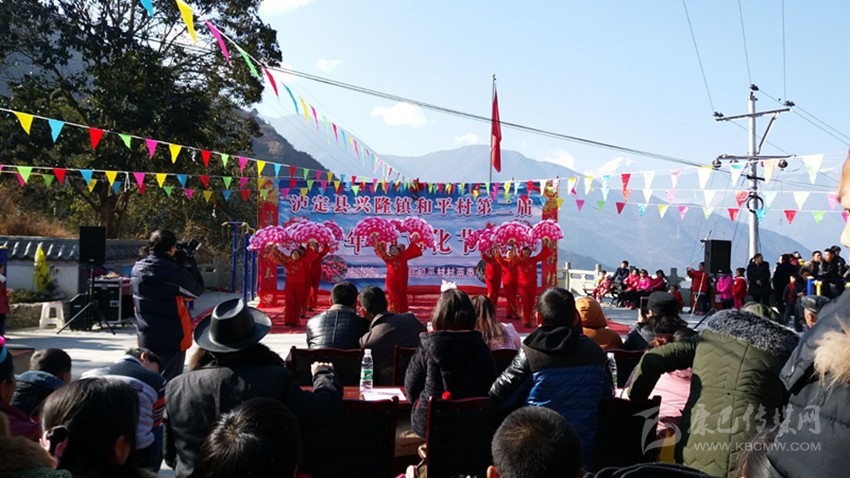 鼓聲喧天、歌聲飛揚(yáng),現(xiàn)場到處洋溢著濃濃的節(jié)日氛圍。浩浩蕩蕩的隊伍也引來了不少村民和游客們的關(guān)注。特別是隊伍中幾個唱山歌的村民獨(dú)特的腔調(diào)和唱詞盡展和平村山歌的特色。和平村每到冬月以后,村民家家戶戶便開始?xì)⒛曦i,相互串門,吃年豬宴,這一習(xí)俗已傳承百年,在和平村村民的心中,年豬文化節(jié)是一個慶祝豐收的節(jié)日。上午十點(diǎn)半,游行隊伍來到了和平村村級活動室,“豬王”被放在了舞臺中間,焚香祈福后,當(dāng)?shù)卮迕裼幂d歌載舞的方式共慶這一節(jié)日的成功舉辦。村民們自編自演的舞蹈《祖國您好》《喜慶臨門》《紅梅贊》,現(xiàn)場表演唱山歌打草鞋,每一支舞,每一首歌都傳遞著村民們對黨對祖國對新生活的無限熱愛。