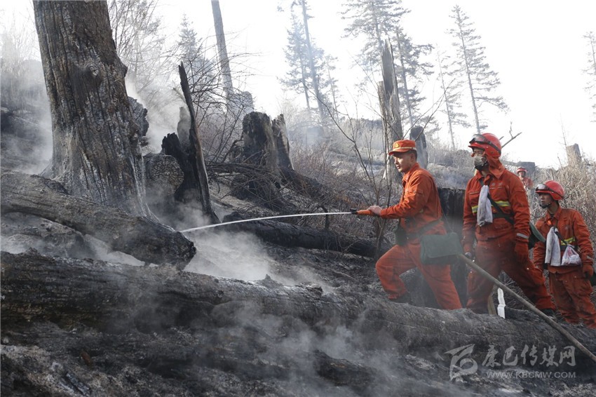 2月10日,火頭蔓延至火場(chǎng)東北一線,參戰(zhàn)官兵發(fā)現(xiàn)幾處被冰雪覆蓋的水源,火場(chǎng)前指決心改變戰(zhàn)法,采用7組水泵串聯(lián)接力向火場(chǎng)供水主攻明火,常規(guī)機(jī)具輔助配合消除煙點(diǎn)的方式,將部隊(duì)分為水泵和常規(guī)機(jī)具兩個(gè)梯隊(duì),在火場(chǎng)火勢(shì)最為猛烈的東北側(cè)展開滅火作戰(zhàn)。參戰(zhàn)官兵用自身攜帶的鍬鎬奮力破冰面抽水,在水泵的助力下,明火得到了有效壓制并逐步熄滅。隨后,部隊(duì)和地方群眾全部轉(zhuǎn)入火場(chǎng)清理看守階段。