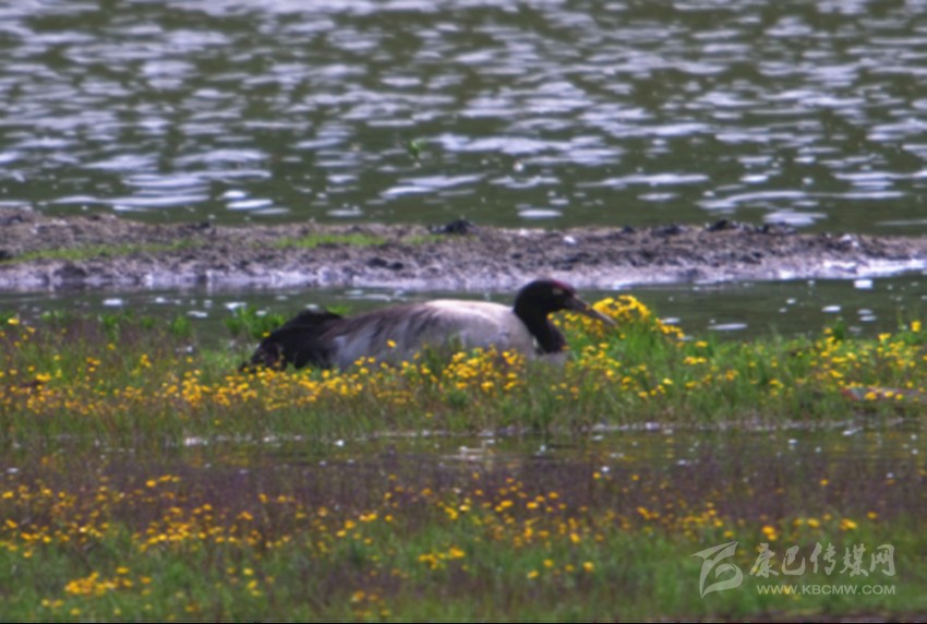 黑頸鶴是唯一生長繁殖在高原的鶴類,國家一級保護動物,冬季10月左右遷往云貴高原等低緯度地區(qū),2月下旬陸續(xù)返遷回到高原,到達白玉縣保護區(qū)時間一般在4月下旬。這次黑頸鶴繁殖巢穴位于麥拉降措湖邊一塊四面環(huán)水的平臺上,鮮花盛開,相對隱秘。