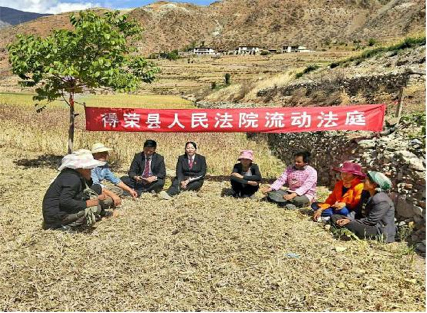 在曲雅貢鄉(xiāng)二號(hào)壩村進(jìn)行法律宣講時(shí),村民澤某請(qǐng)求法院判決其和丈夫扎某離婚,“流動(dòng)法庭”法官立即在田間地頭組織調(diào)解。調(diào)解過程中當(dāng)事人情緒抵觸、相互埋怨,尤其涉及到財(cái)產(chǎn)分割和子女撫養(yǎng)等問題時(shí)情緒波動(dòng)大,場(chǎng)面一度僵持。法官憑借豐富的調(diào)解經(jīng)驗(yàn),先從講解相關(guān)法律規(guī)定入手,告知當(dāng)事人享有的權(quán)利義務(wù),而后對(duì)離婚財(cái)產(chǎn)分割、子女撫養(yǎng)問題從情理法多角度層層剖析,促使雙方達(dá)成和解協(xié)議,有效化解了矛盾?!傲鲃?dòng)法庭”以宣促調(diào)、以案說法,達(dá)到了審理一案、教育一片、穩(wěn)定一方的效果。