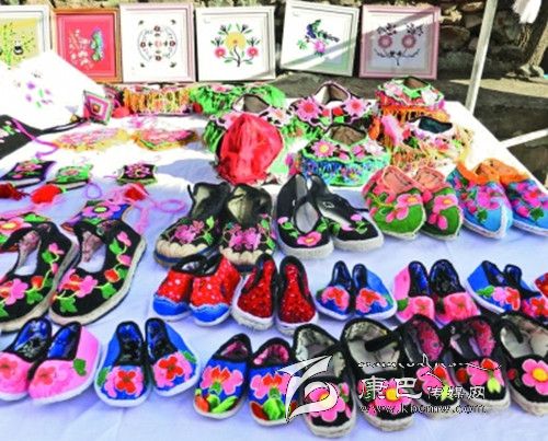 嵐安刺繡是瀘定的民族特色刺繡產(chǎn)品,是傳統(tǒng)民族純手工藝品,由于繡品一直被當(dāng)?shù)厝罕娮援a(chǎn)自用,一直沒(méi)有走向市場(chǎng),為幫助嵐安鄉(xiāng)傳承傳統(tǒng)文化,讓?shí)拱泊汤C找到銷路,取得經(jīng)濟(jì)收益,該縣婦聯(lián)利用舉辦第四屆紅櫻桃節(jié)的時(shí)機(jī),為刺繡產(chǎn)品牽線搭橋,將嵐安婦女刺繡作品納入到“三項(xiàng)建設(shè)促發(fā)展瀘定鄉(xiāng)村換新顏”成果展銷中,以提升刺繡作品的知名度。圖為參展的嵐安繡品。