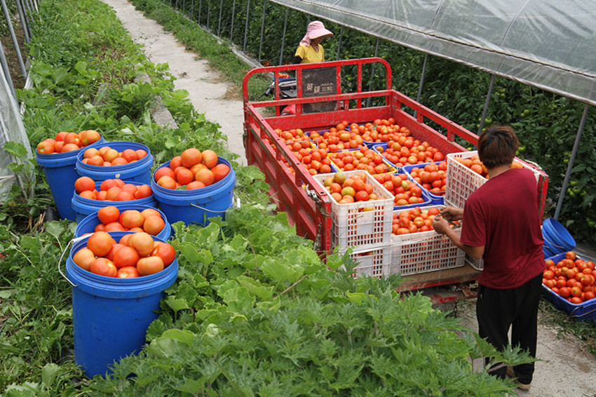 村民正在裝運西紅柿。