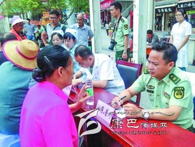 在第87個建軍節(jié)來臨之際,7月31日,武警瀘定醫(yī)院官兵在瀘定橋廣場開展迎“八一”義診活動,免費為群眾看病、送醫(yī)送藥,解答健康問題、普及健康知識,受到廣大市民的熱烈歡迎,前來求醫(yī)問診者絡(luò)繹不絕。圖為義診活動現(xiàn)場。 (王可富 攝影報道)