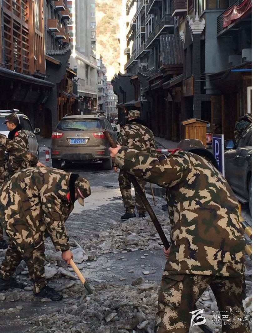本網(wǎng)報(土登 文/圖)大雪過后,康定城的部分陰面路段結(jié)起了厚厚的冰,給過往行人及車輛帶來了極大的安全隱患。1月31日,武警甘孜支隊第三大隊組織官兵義務(wù)掃雪除冰,贏得了過往行人點贊。圖為官兵們在清掃康定市水井子街道結(jié)冰路面。