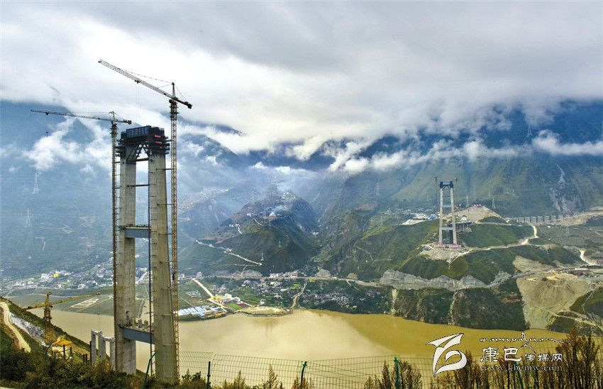 從高處俯瞰,兩座188米高的主墩十分壯觀,在康定一側(cè)的主墩下,汽車長龍如同螞蟻一樣大小,沿著318國道向康定進發(fā)。
