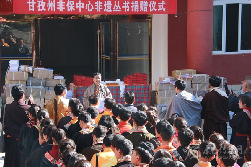 (本網(wǎng)記者 益西貢布 攝影報(bào)道)5月13日,州文化館非遺保護(hù)中心非遺叢書捐贈(zèng)儀式在四川省藏文學(xué)校舉行。此次捐贈(zèng)的700多冊(cè)非遺書籍和畫冊(cè)是十多年來(lái)州文化館非遺保護(hù)中心通過(guò)各種渠道收集、整理、出版的非遺叢書。圖為捐贈(zèng)儀式現(xiàn)場(chǎng)。