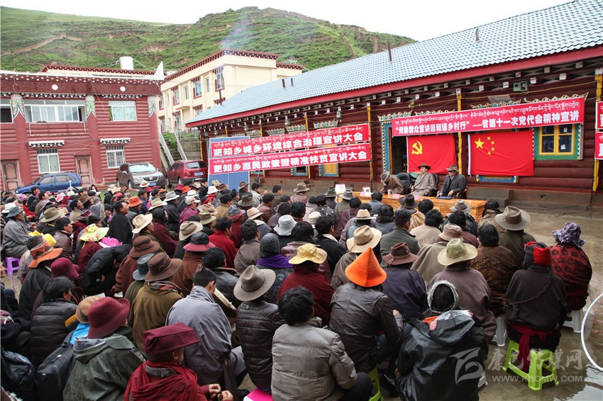 上午10時(shí)30分,宣講在濛濛細(xì)雨中開(kāi)始了。只見(jiàn)村民們?nèi)纪χ毖鼦U端坐在雨中,一雙雙渴望的眼睛聚焦在宣講臺(tái)上;宣講員松吉尼瑪用生動(dòng)的例子、經(jīng)典的藏族諺語(yǔ)講述了黨的政策和省第十一次黨代會(huì)精神,生動(dòng)感人的宣講讓現(xiàn)場(chǎng)400余名村民、寺廟僧尼和各級(jí)干部滿意的笑聲瞬間蓋過(guò)了打著持久戰(zhàn)的雨聲。