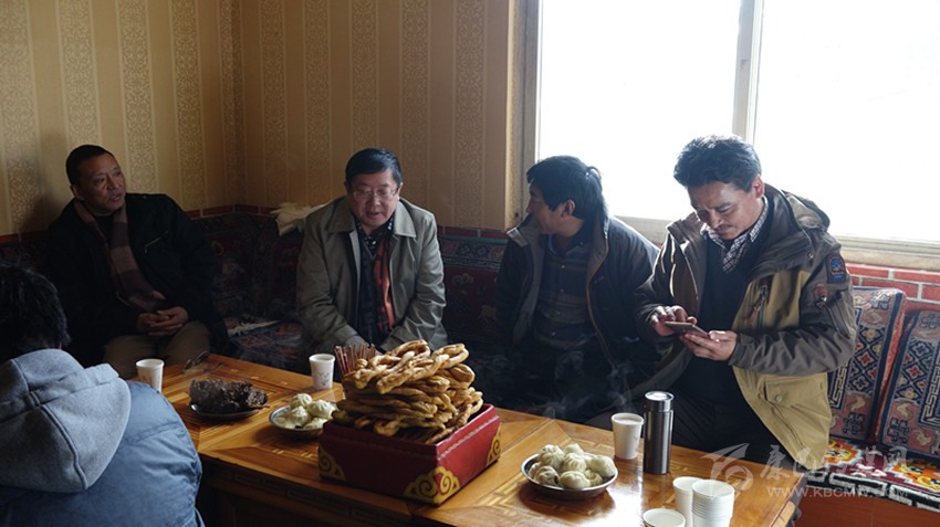 州醫(yī)院院長(zhǎng)多吉(中)與鄉(xiāng)村干部共謀發(fā)展大計(jì)。