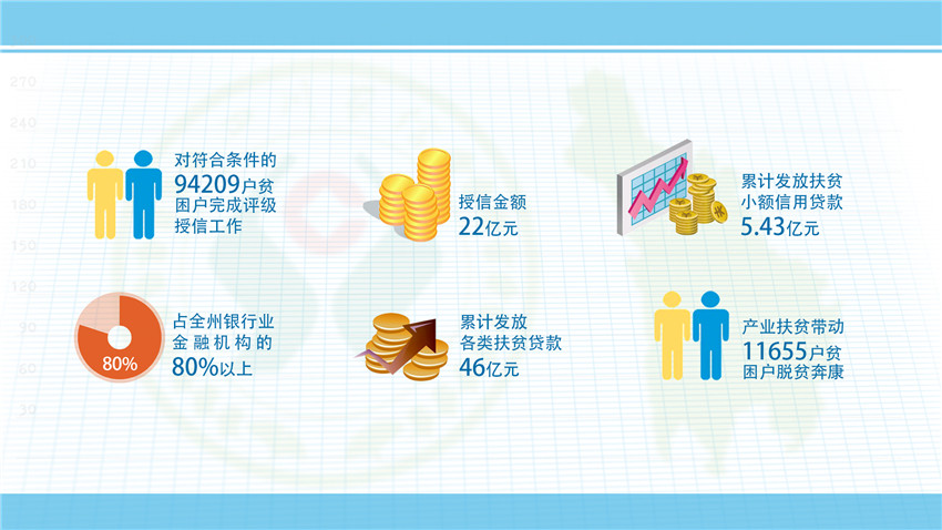 ——強(qiáng)化信貸扶持。緊緊圍繞全州脫貧退出總體目標(biāo),打破各縣劃分片區(qū)、劃分任務(wù)的局面,使脫貧攻堅(jiān)工作從行政手段調(diào)整到市場競爭和民生工程兼顧,堅(jiān)持“三個(gè)一百”——即百分百對符合條件的建檔立卡貧困戶進(jìn)行評級授信,授信面達(dá)到100%;百分百滿足貧困戶有效信貸需求;百分百滿足產(chǎn)業(yè)帶動扶貧項(xiàng)目有效信貸需求,加強(qiáng)與18個(gè)縣黨委政府的溝通對接,瞄準(zhǔn)每個(gè)縣的地方特產(chǎn)產(chǎn)業(yè),因地制宜,為每個(gè)縣量身打造“一縣一策”的金融服務(wù)方案,累計(jì)發(fā)放各類產(chǎn)業(yè)、項(xiàng)目帶動扶貧貸款20.69億元。
