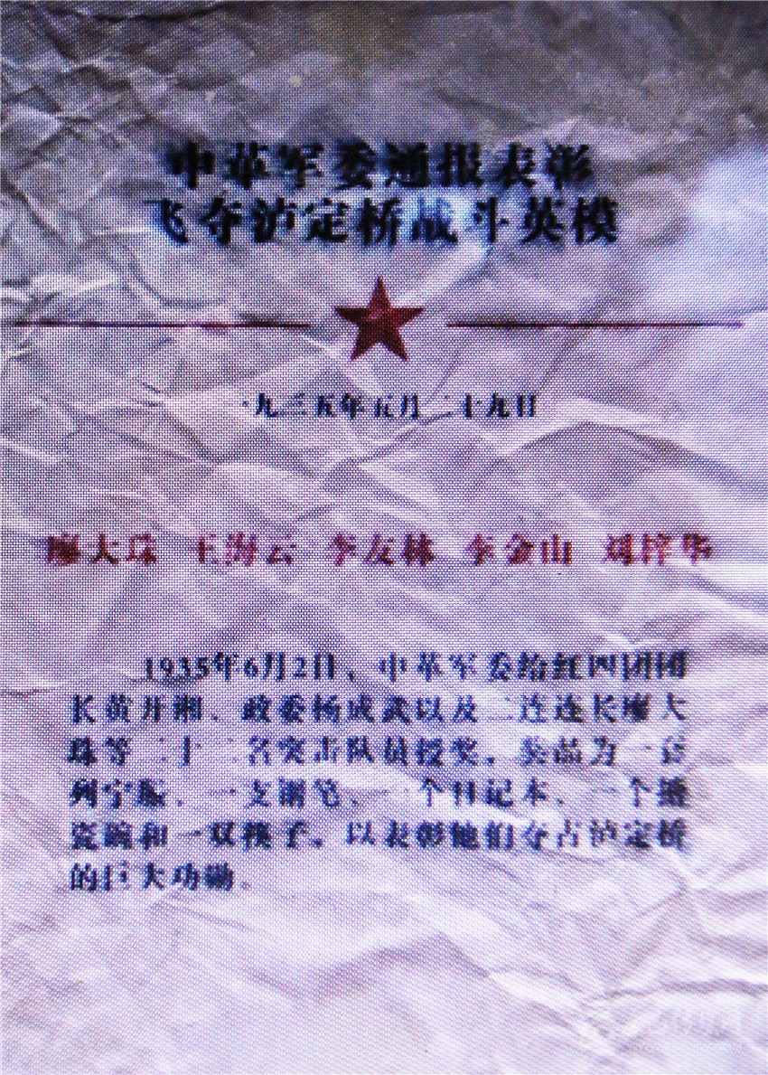 劉東升談起父親當(dāng)年作為飛奪瀘定橋22勇士之一,心情無比激動?!案赣H當(dāng)年如果不是努力爭取,就沒有后來的勇士稱號,更沒有中革軍委的嘉獎?!?935年5月,北上抗日的紅軍向天險大渡河挺進(jìn)。大渡河水流湍急,兩岸都是高山峻嶺,只有一座鐵索橋可以通過。這座鐵索橋,就是紅軍北上必須奪取的瀘定橋。