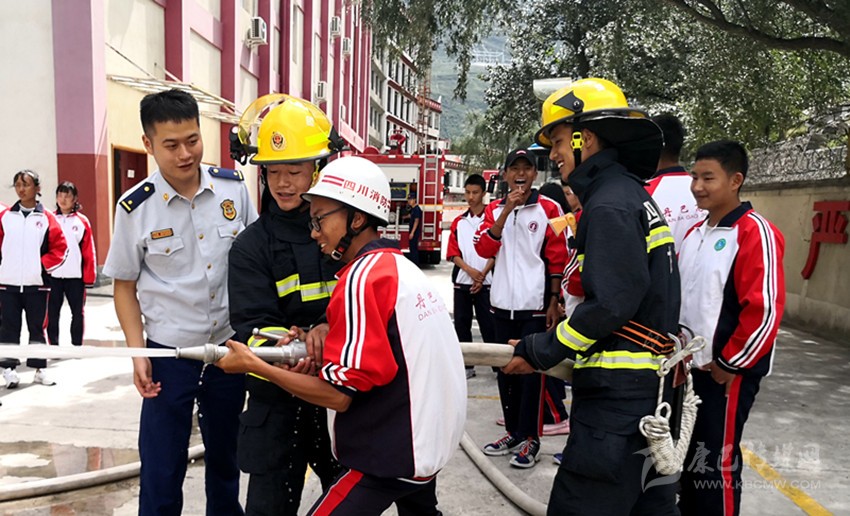 消防隊(duì)員指導(dǎo)學(xué)生使用消防器具。