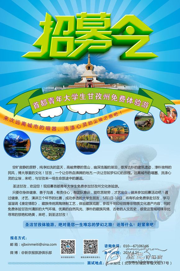 該活動(dòng)我州將與新京報(bào)、北京電視臺(tái)、騰訊網(wǎng)等媒體聯(lián)合招募首都青年大學(xué)生免費(fèi)參加甘孜州文化體驗(yàn)游。 首都青年大學(xué)生要通過(guò)健康、才藝、演講三個(gè)環(huán)節(jié)的比賽,成功參選的大學(xué)生朋友,5月1日-10日,將有機(jī)會(huì)帶著六項(xiàng)任務(wù)走進(jìn)甘孜州,體驗(yàn)甘孜州的生活,感受甘孜州的獨(dú)特魅力。