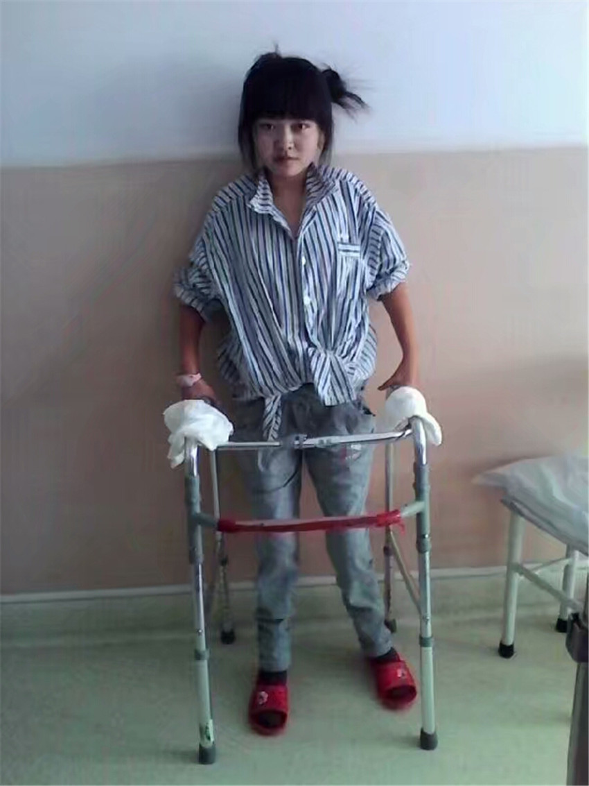23歲時,深圳的楊先生爽快地幫助朱靈湊夠了手術費用。2013年9月,朱靈在親人的護送下,到北京接受了手術治療,手術很成功。但做牽引、吊腿、揉搓、重壓等康復訓練,如遭酷刑,萬般痛苦,她曾想放棄。在病友和親屬的鼓勵下,她倚墻靠壁,憑借器具,大汗淋漓,通過一個多月的康復鍛煉,朱靈終于站了起來。